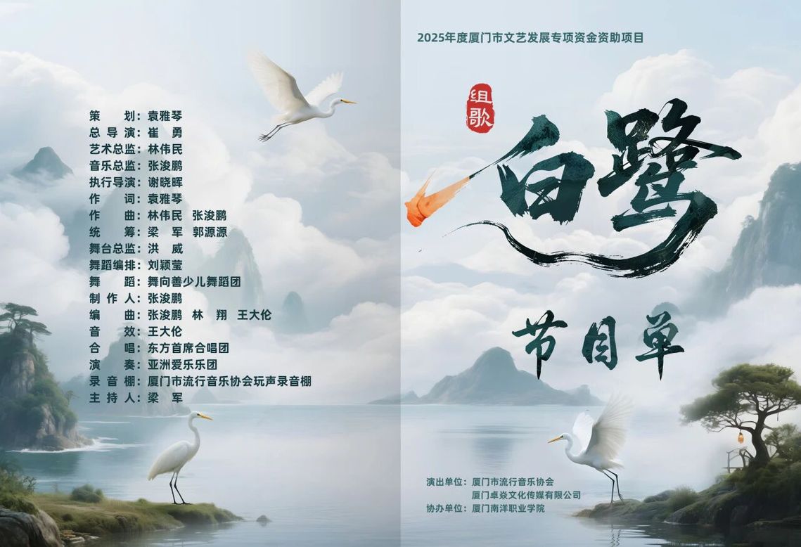 作为厦门市文艺发展专项资金重点扶持的精品文艺项目,组歌《白鹭》汇聚了一众业界知名创作者与表演者。策划及作词袁雅琴、总导演崔勇、艺术总监林伟民、音乐总监张浚鹏等核心主创团队携手东方首席合唱团、亚洲爱乐乐团等实力团体,由厦门市流行音乐协会、厦门卓焱文化传媒有限公司联合出品,以高水准的艺术呈现传递深厚的文化内涵。