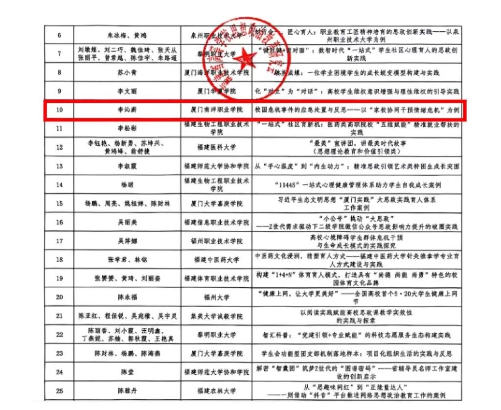 据悉,福建省高等学校思想政治教育研究会于2025年5月启动征集,共收到301篇案例,经专家匿名评审,最终评选出优秀工作案例一等奖20篇,二等奖49篇,三等奖65篇。
