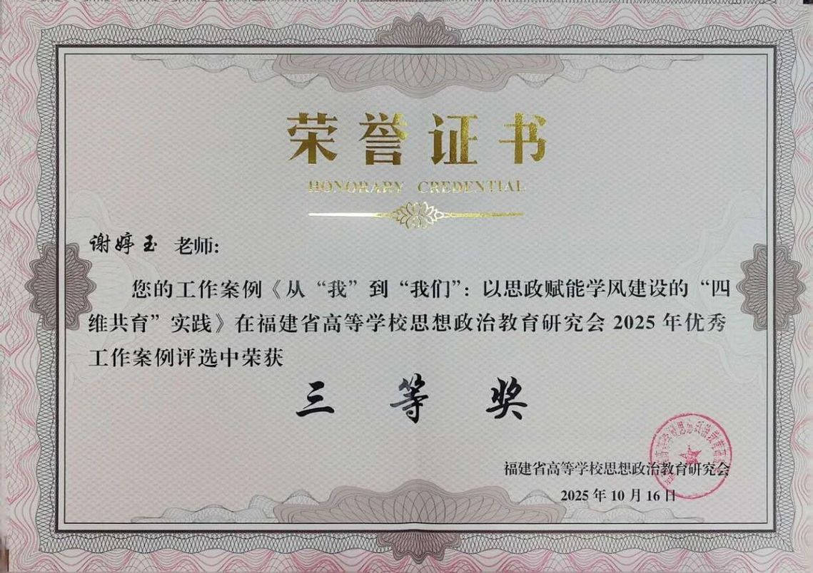 近日,福建省高等学校思想政治教育研究会2025年优秀工作案例评选结果揭晓,我校电影学院辅导员李沁蔚工作案例《校园危机事件的应急处置与反思——以“家校协同干预情绪危机”为例》、医学院分团委书记谢婷玉工作案例《从“我”到“我们”:以思政赋能学风建设的“四维共育”实践》分别荣获二等奖、三等奖。