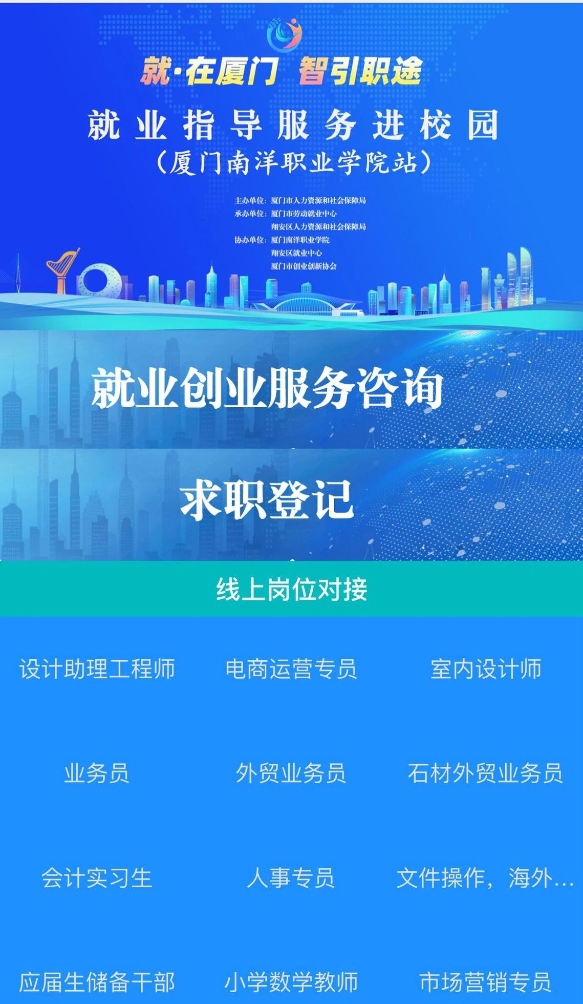 厦门南洋职业学院就业创业服务站是在厦门市人力资源和社会保障局指导下,为打造“15分钟就业创业服务圈”、实现“家门口”精准服务而设立的重要平台,将为在校学生提供政策咨询、职业指导、岗位对接、创业扶持等一站式服务。