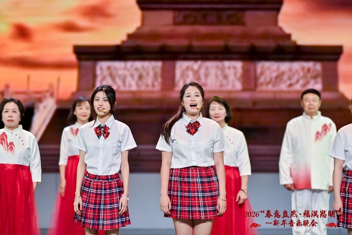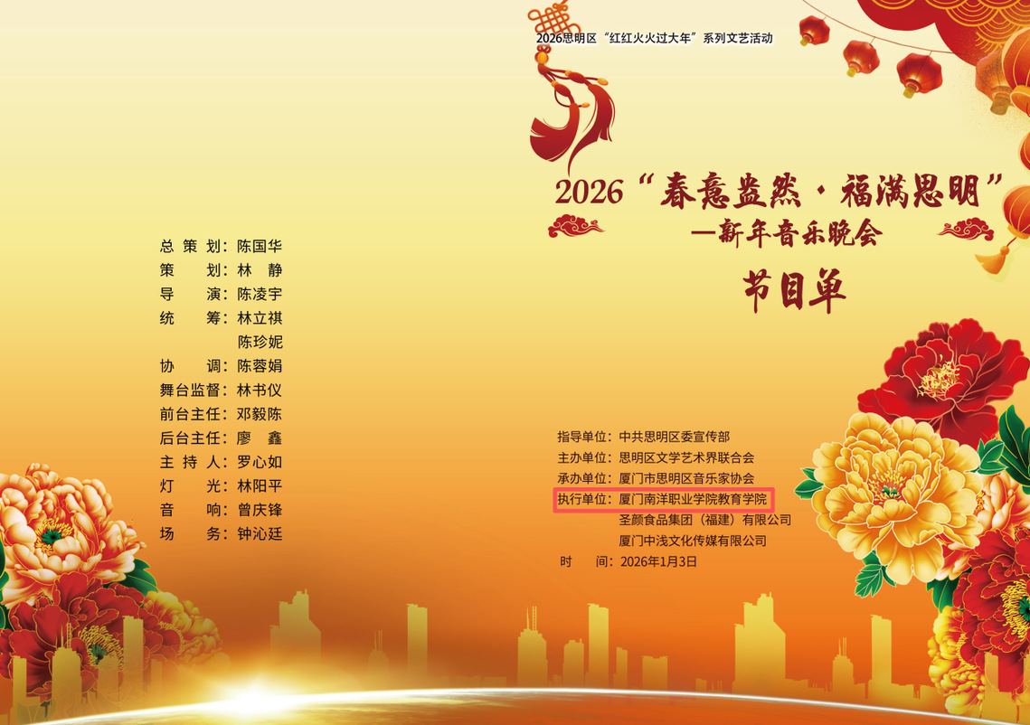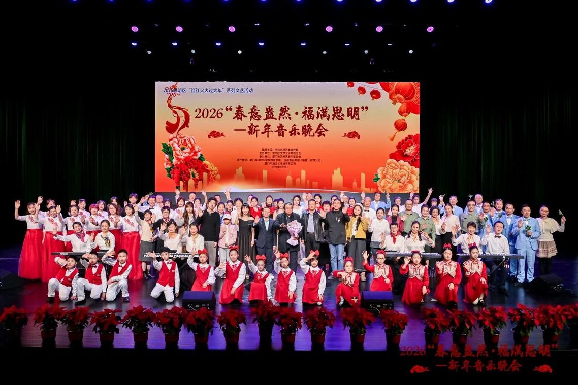1月3日晚,由中共思明区委宣传部指导、思明区文学艺术界联合会主办、思明区音乐家协会承办的2026“春意盎然·福满思明”新年音乐晚会在思明区青少年宫圆满落幕。我校作为执行单位之一,教育学院师生积极参与并倾情演绎,为全场观众带来精彩的歌曲表演节目,执行校长钟石根、校长助理侯红科受邀出席晚会。